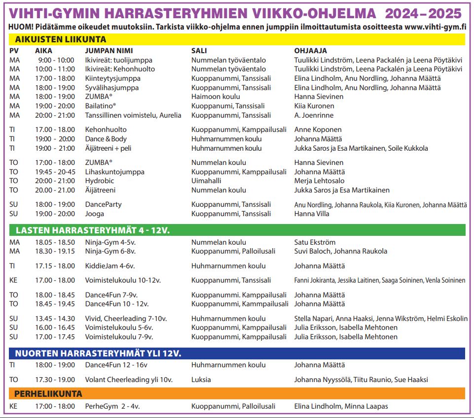 Vihti-Gymin kauden 2024-2025 viikkokalenteri on julkaistu nettisivuillamme ja somessa heinäkuun ensimmäisellä viikolla ja ilmoittautuminen tunneille aukeaa elokuussa.