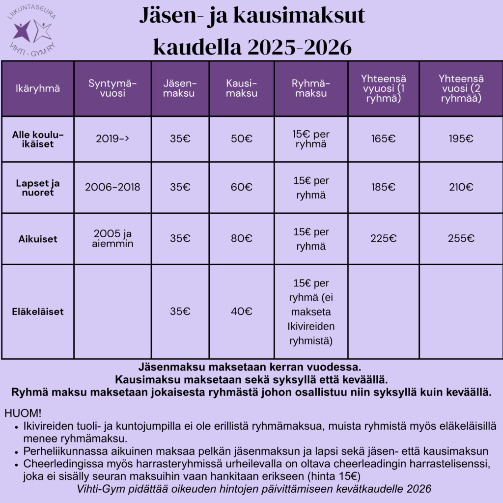 Huom. 35€ jäsenmaksu maksetaan ilmoittautumisen yhteydessä (vain kerran). Kausimaksu ja ryhmämaksut maksetaan sekä syksyllä että keväällä. Ryhmämaksu ja kausimaksu koskevat vain harrasteryhmiä.