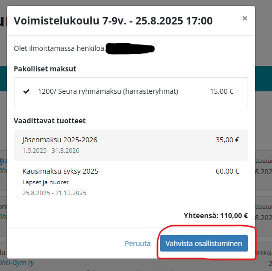 Kun klikkaat osallistun-painiketta sen jälkeen avautuu ponnahdusikkuna, jossa on ryhmän maksutiedot. Jokaiseen ryhmään tulee ilmoittautua erikseen. Jäsenmaksu ja Kausimaksu tulee maksettavaksi vain kerran ensimmäisen ilmoittautumisen yhteydessä, ryhmämaksu muodostuu joka ryhmästä. Valitsemalla Vahvista osallistuminen, osallistumisesi rekisteröityy ja siitä muodostuu lasku.