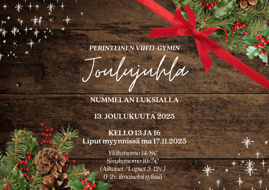 Liikuntaseura Vihti-Gym ry järjestää joulujuhlan, joka pidetään lauantaina 13.12.2025 Luksialla, Ojakkalantie 2, Nummela .